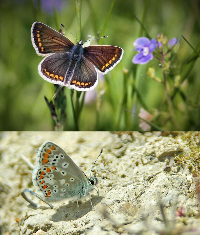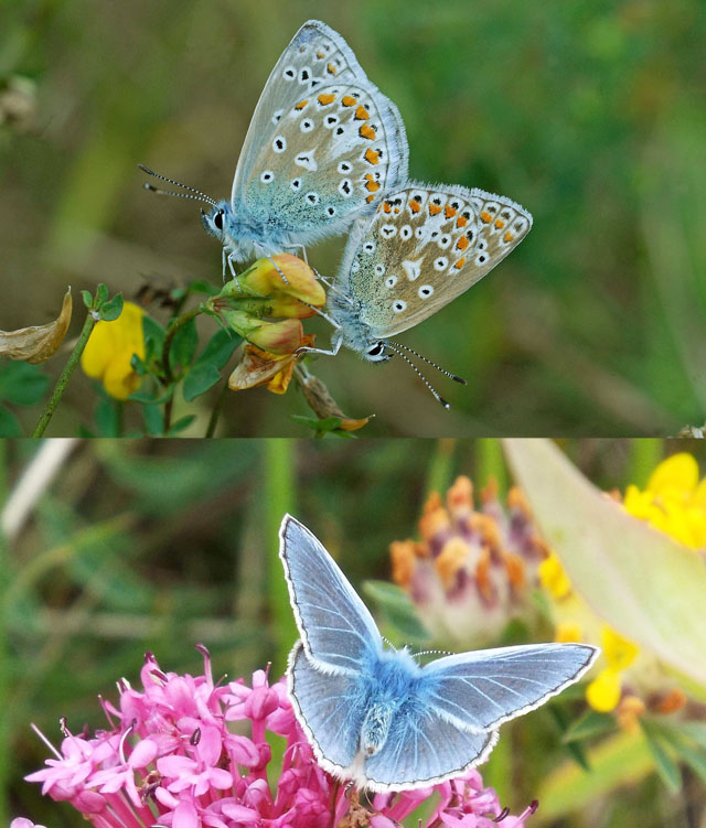 The male of this species is blue whereas the females are normally brown with orange markings. The females can also be blue but they keep the orange markings whereas the males don’t. Both have white margins around the wing. Unlike the brown argus the common blues have a cell spot on the underside of the forewing.
