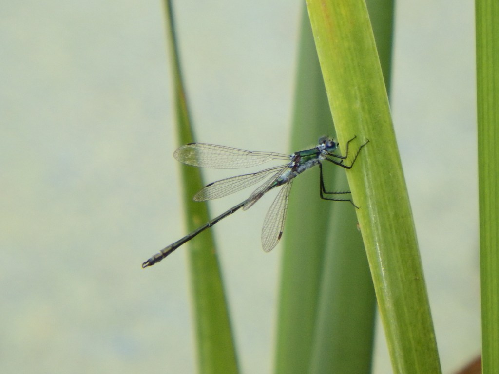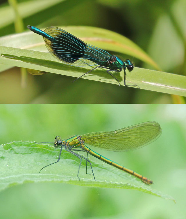 One of Britain’s biggest damselflies. The male has large blue patches on each of its four wings, and a polished looking blue/green body. The females wings are a metallic green, with a polished looking green body