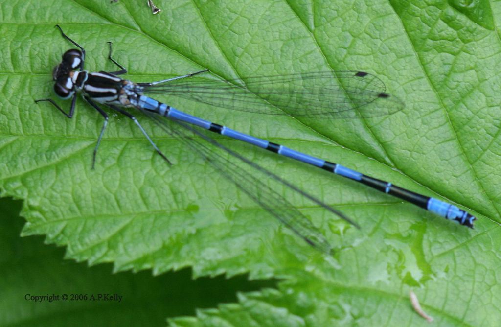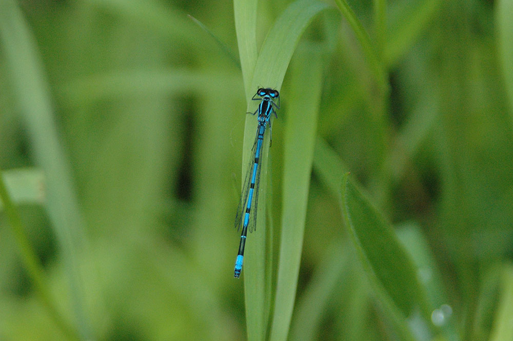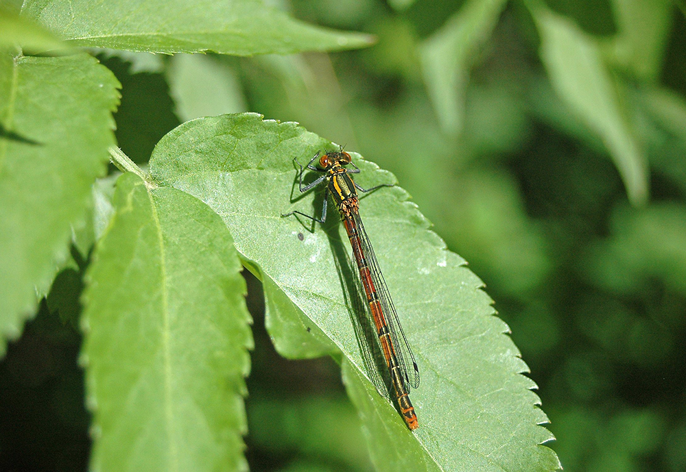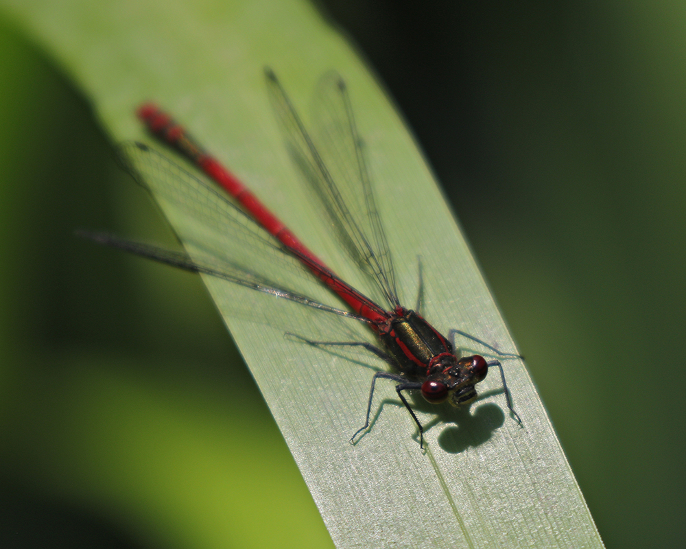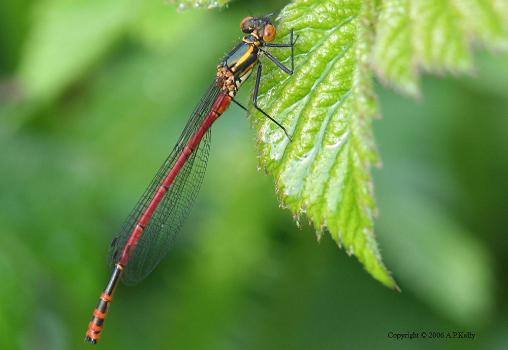 One of the commonest British damselflies, found throughout the country and one of the first signs of spring. Both sexes have red abdomens; with yellow sides to its metalic green/black thorax.