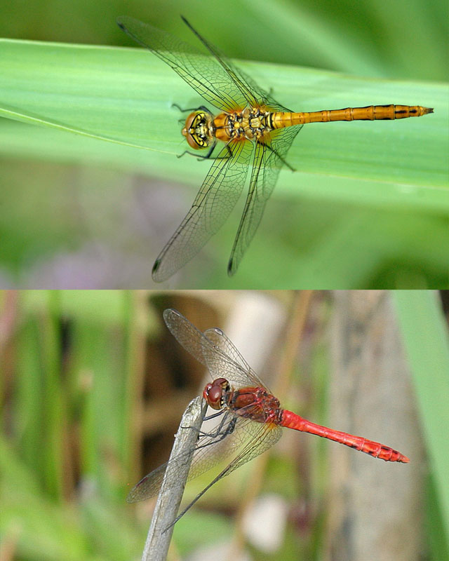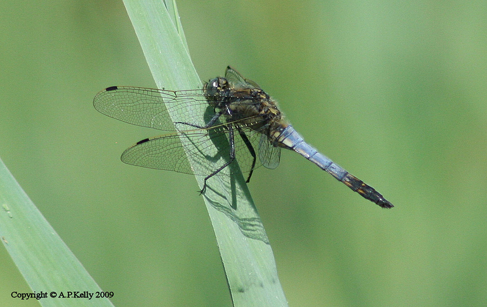 The males has a blue abdomen with a black tips and are commonly known as the blue arrows. The females are yellow-brown with dark brown marking son the edge of the abdomen.